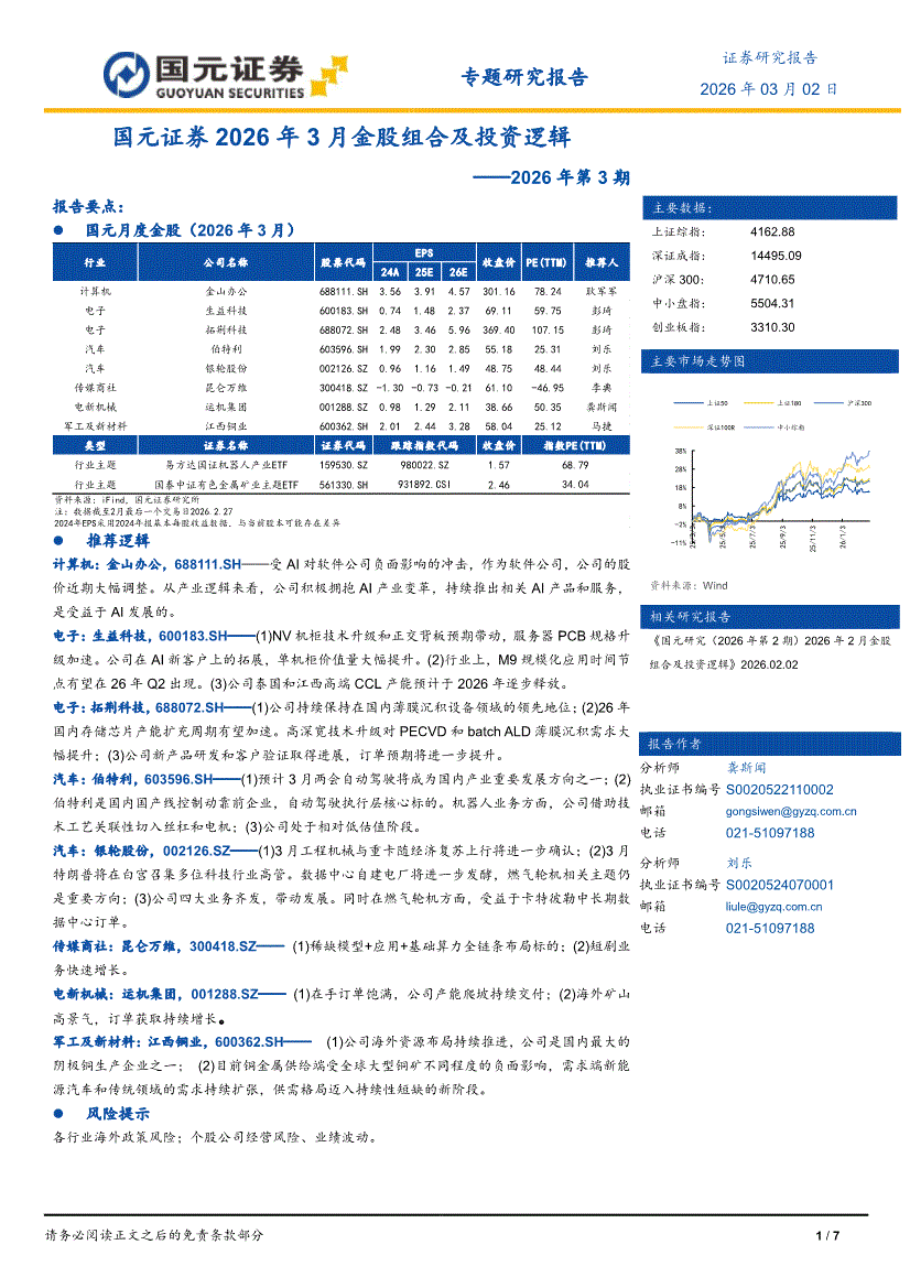 国元证券-2026年3月金股组合及投资逻辑:2026年第3期-260302