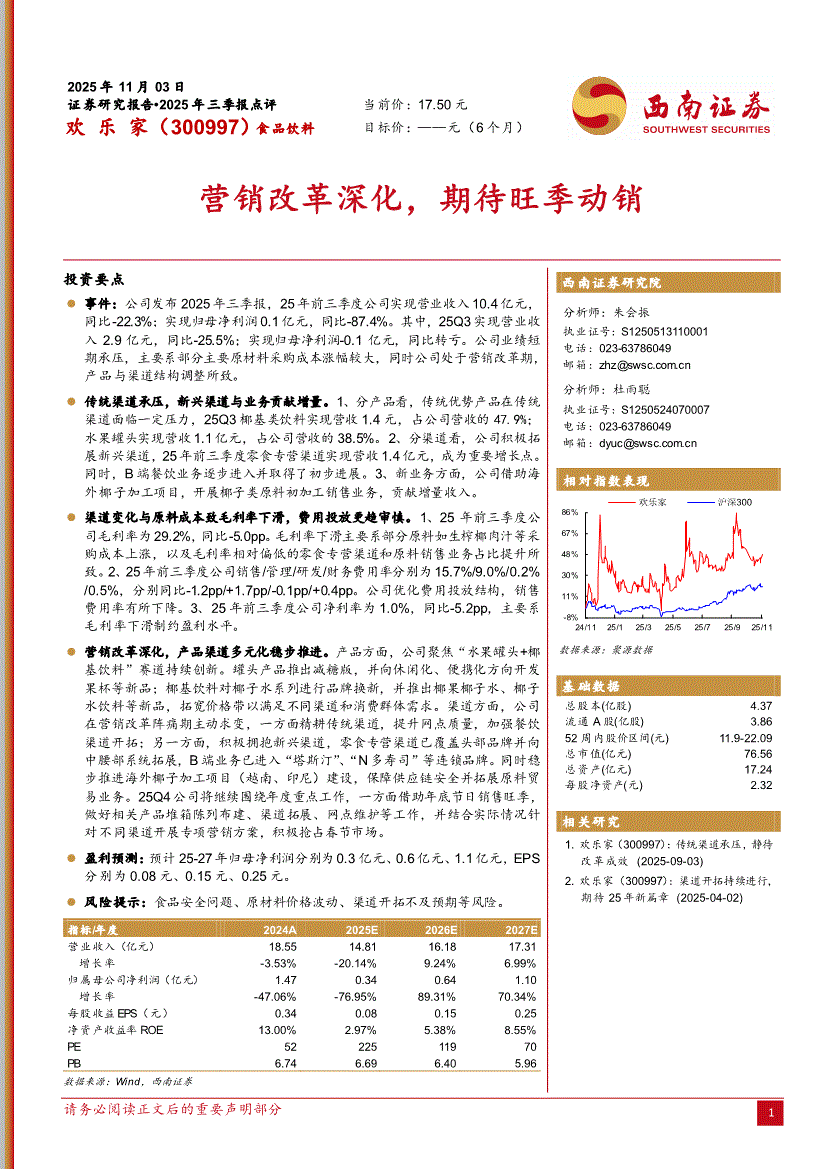 欢乐家:西南证券-欢乐家-300997-营销改革深化,期待旺季动销-251103