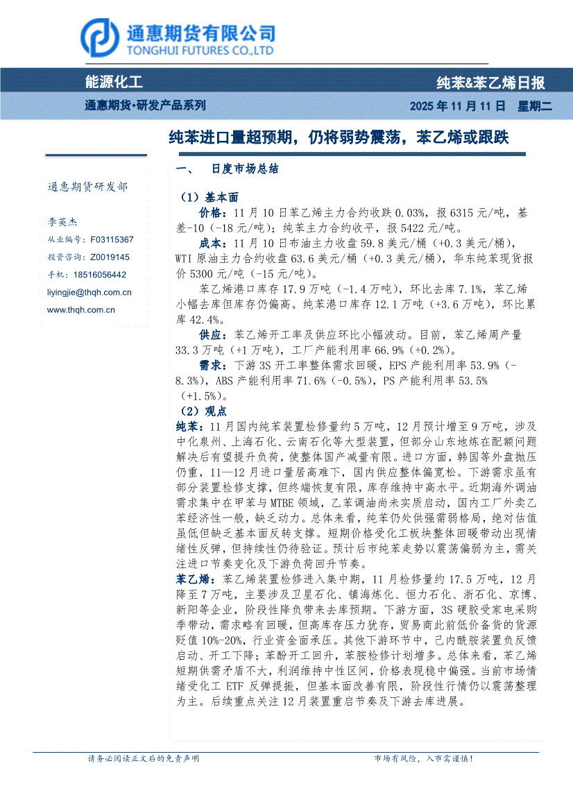通惠期货-纯苯&苯乙烯日报:纯苯进口量超预期,仍将弱势震荡,苯乙烯或跟跌-251111