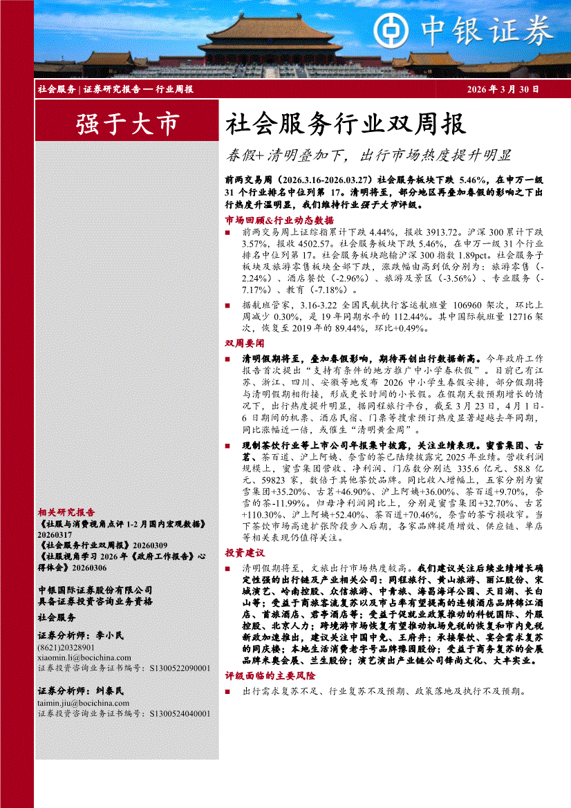 社会服务行业:中银国际-社会服务行业双周报:春假+清明叠加下,出行市场热度提升明显-260330