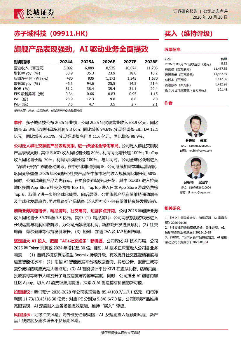 赤子城科技:长城证券-赤子城科技-9911.HK-旗舰产品表现强劲,AI驱动业务全面提效-260330