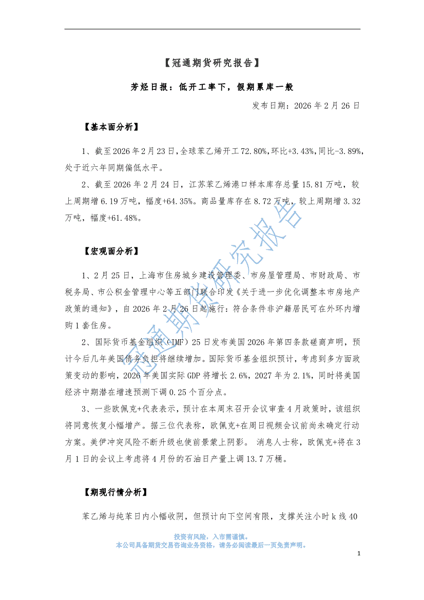 冠通期货-芳烃日报:低开工率下,假期累库一般-260227