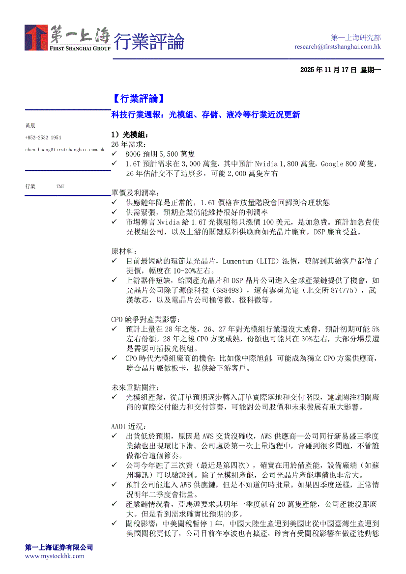 科技行业:第一上海-科技行业周报:光模组、存储、液冷等行业近况更新-251117