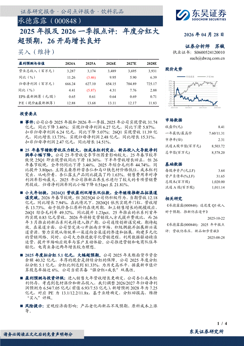 承德露露:东吴证券-承德露露-000848-2025年报及2026一季报点评:年度分红大超预期,26开局增长良好-260428