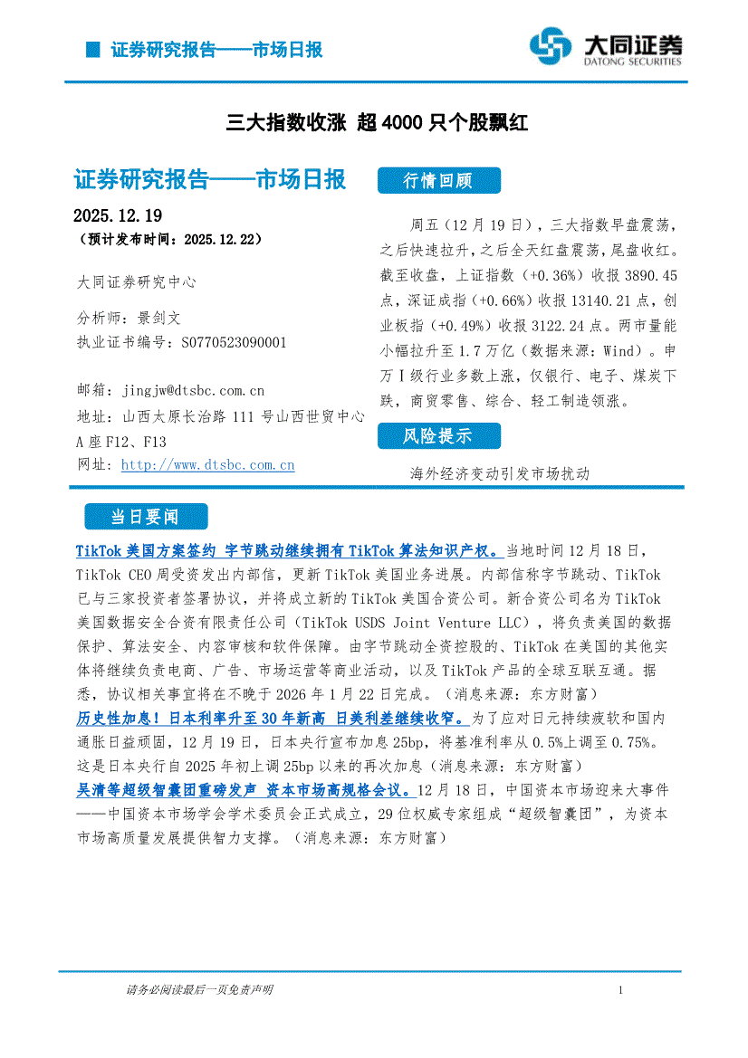 大同证券-市场日报:三大指数收涨,超4000只个股飘红-251219