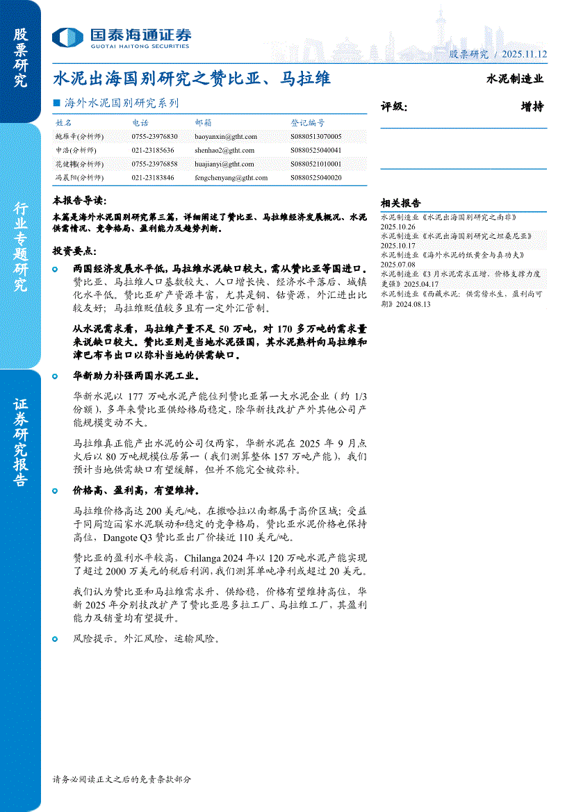 水泥制造行业:国泰海通证券-水泥制造行业海外水泥国别研究系列:水泥出海国别研究之赞比亚、马拉维-251112