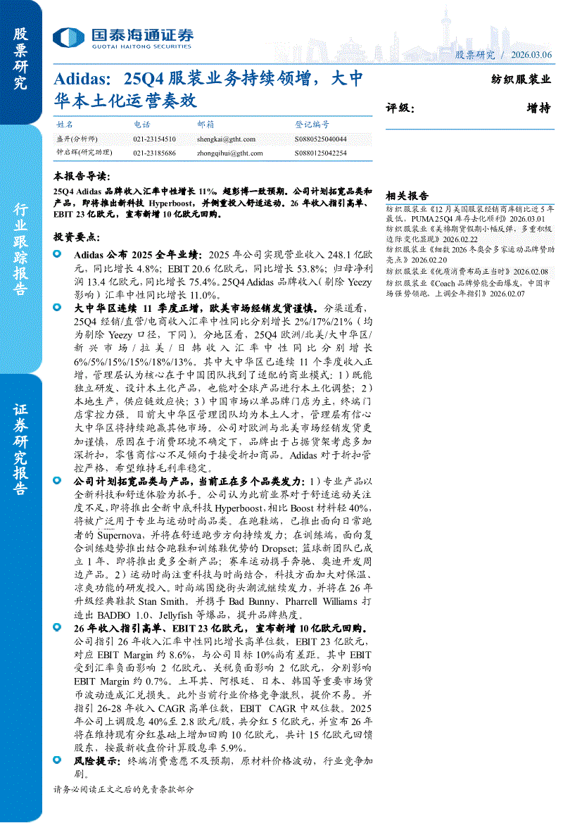 纺织服装行业:国泰海通证券-纺织服装行业Adidas:25Q4服装业务持续领增,大中华本土化运营奏效-260306