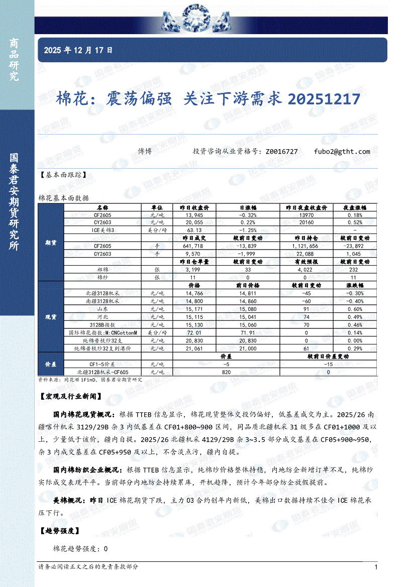 国泰君安期货-棉花:震荡偏强,关注下游需求-251212