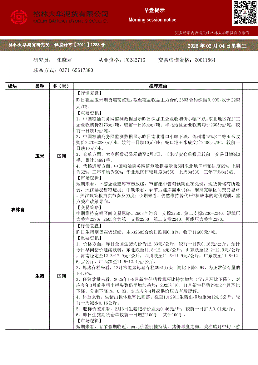 格林大华期货-早盘提示:玉米生猪鸡蛋-260204