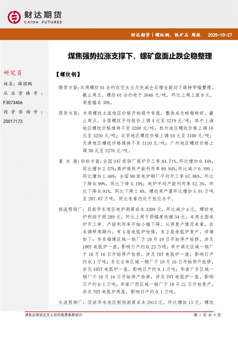 财达期货-螺纹钢、铁矿石周报:煤焦强势拉涨支撑下,螺矿盘面止跌企稳整理-251027