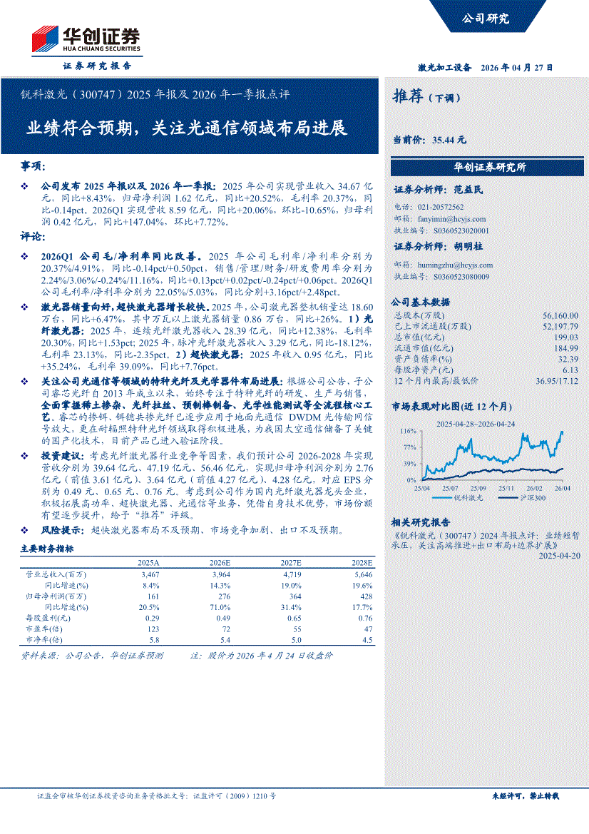锐科激光:华创证券-锐科激光-300747-2025年报及2026年一季报点评:业绩符合预期,关注光通信领域布局进展-260427