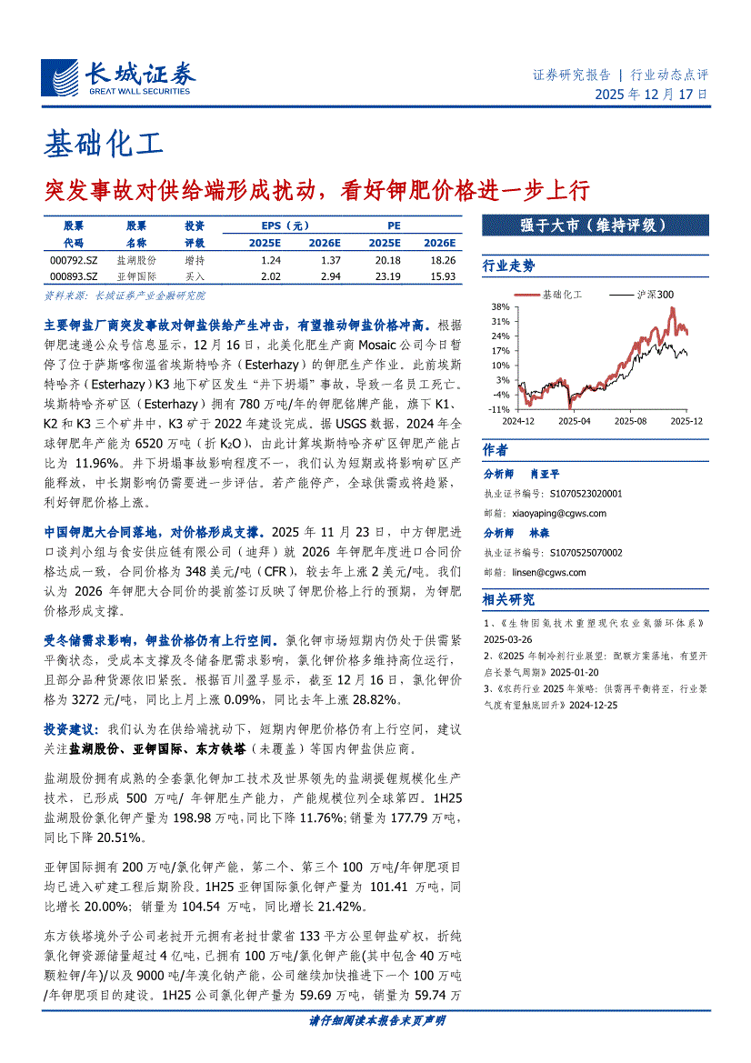 基础化工行业:长城证券-基础化工行业:突发事故对供给端形成扰动,看好钾肥价格进一步上行-251217