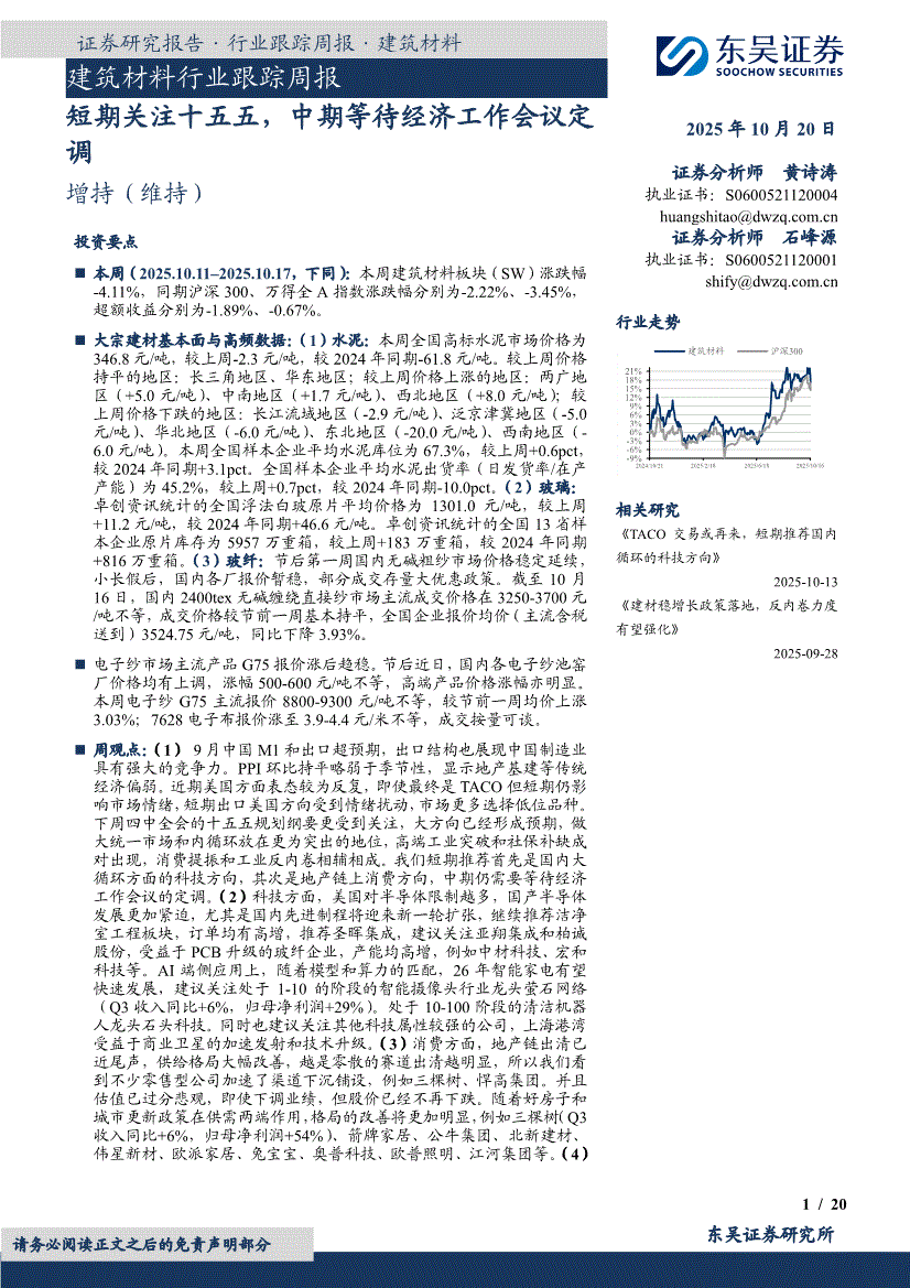 建筑材料行业:东吴证券-建筑材料行业跟踪周报:短期关注十五五,中期等待经济工作会议定调-251020