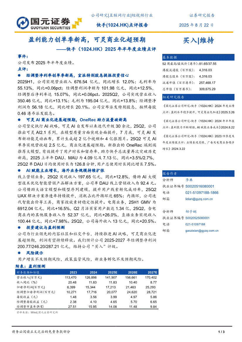 快手:国元证券-快手-1024.HK-2025年半年度业绩点评:盈利能力创单季新高,可灵商业化超预期-250822