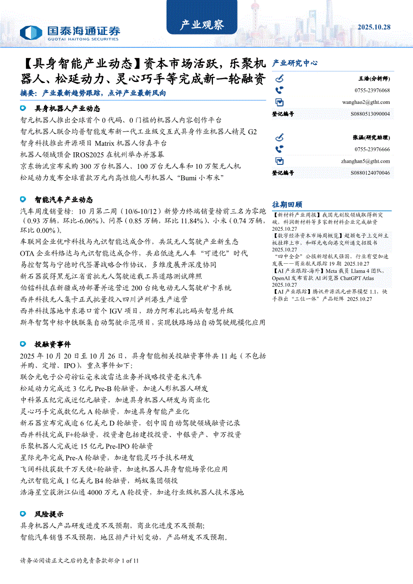 国泰海通证券-产业观察:【具身智能产业动态】资本市场活跃,乐聚机器人、松延动力、灵心巧手等完成新一轮融资-251028