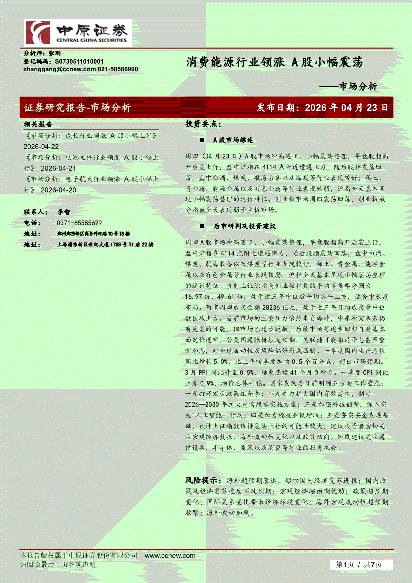 中原证券-市场分析:消费能源行业领涨,A股小幅震荡-260423