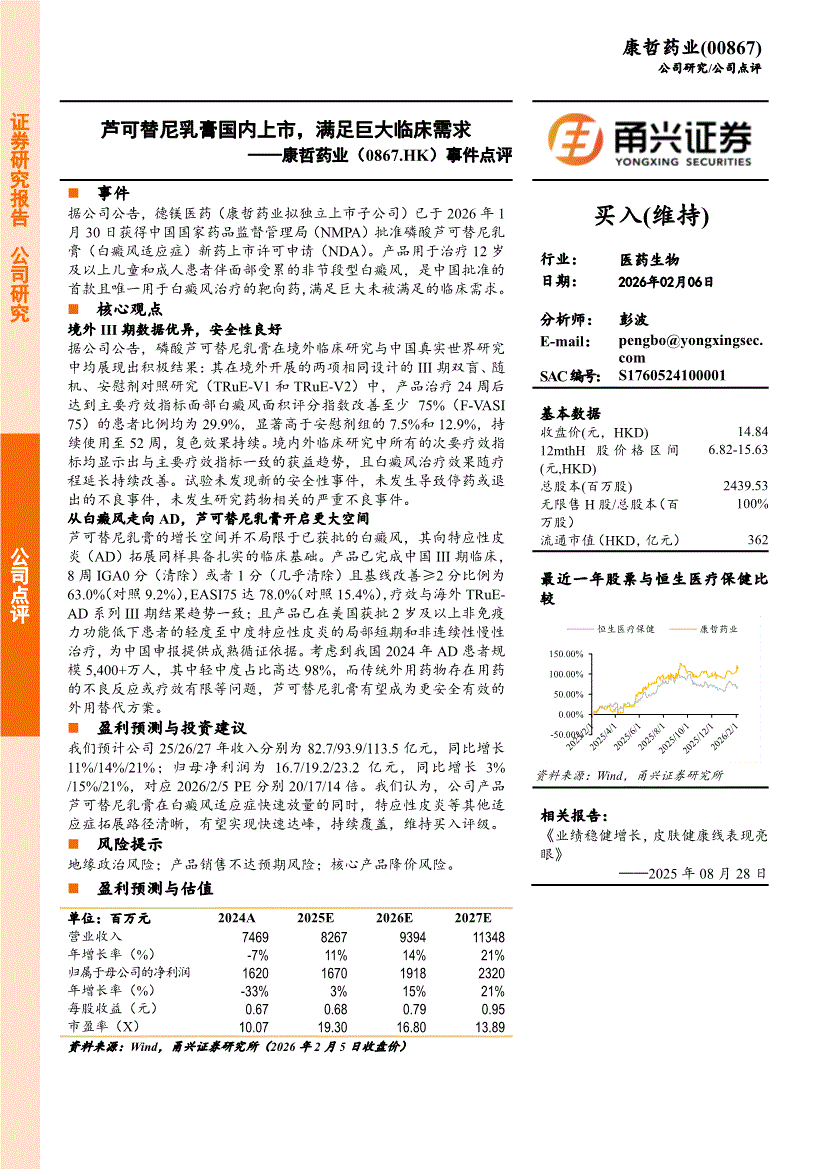 康哲药业:甬兴证券-康哲药业-0867.HK-事件点评:芦可替尼乳膏国内上市,满足巨大临床需求-260206