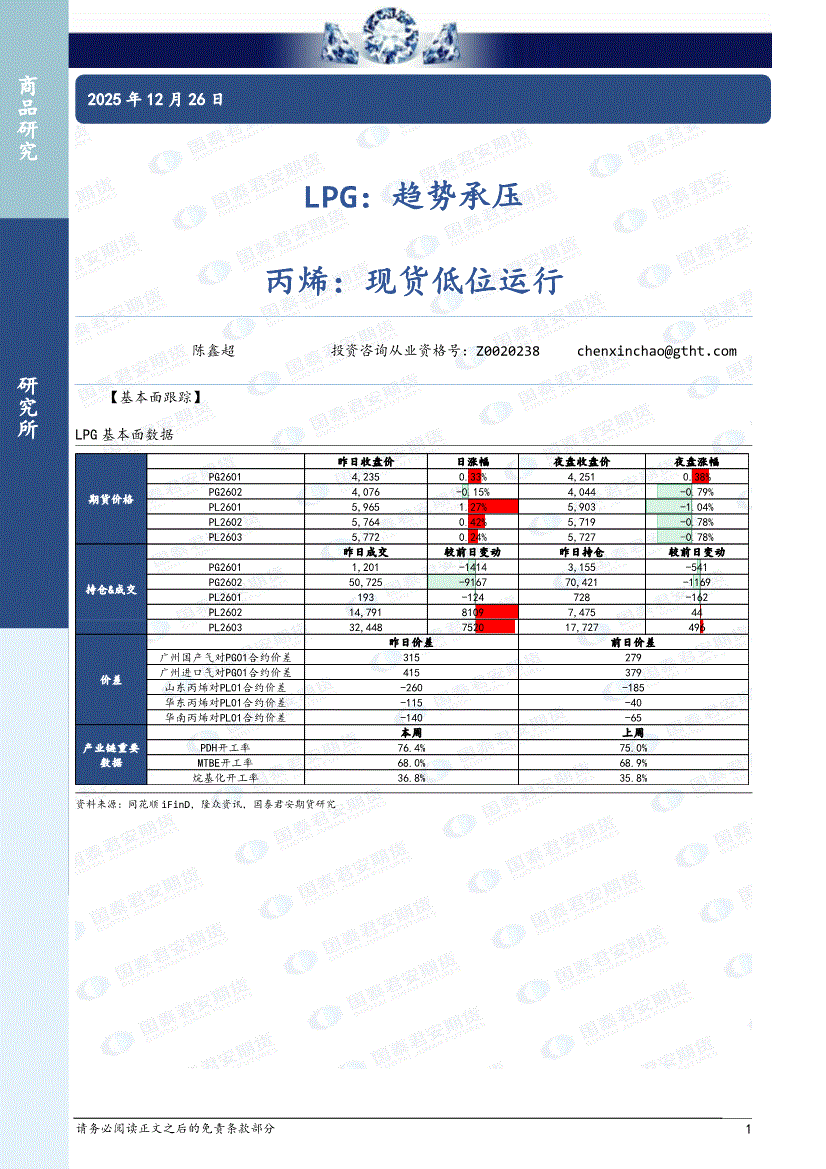国泰君安期货-LPG:趋势承压,丙烯,现货低位运行-251226