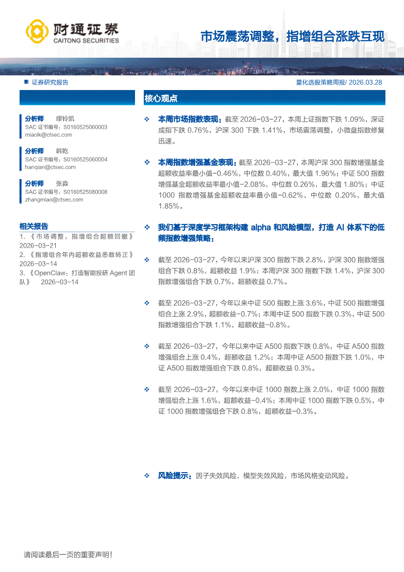 财通证券-量化选股策略周报:市场震荡调整,指增组合涨跌互现-260328