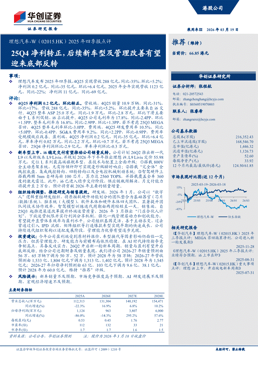 理想汽车~W:华创证券-理想汽车~W-2015.HK-2025年四季报点评:25Q4净利转正,后续新车型及管理改善有望迎来底部反转-260319