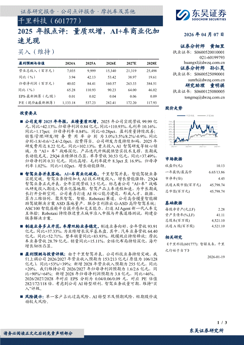 千里科技:东吴证券-千里科技-601777-2025年报点评:量质双增,AI+车商业化加速兑现-260407