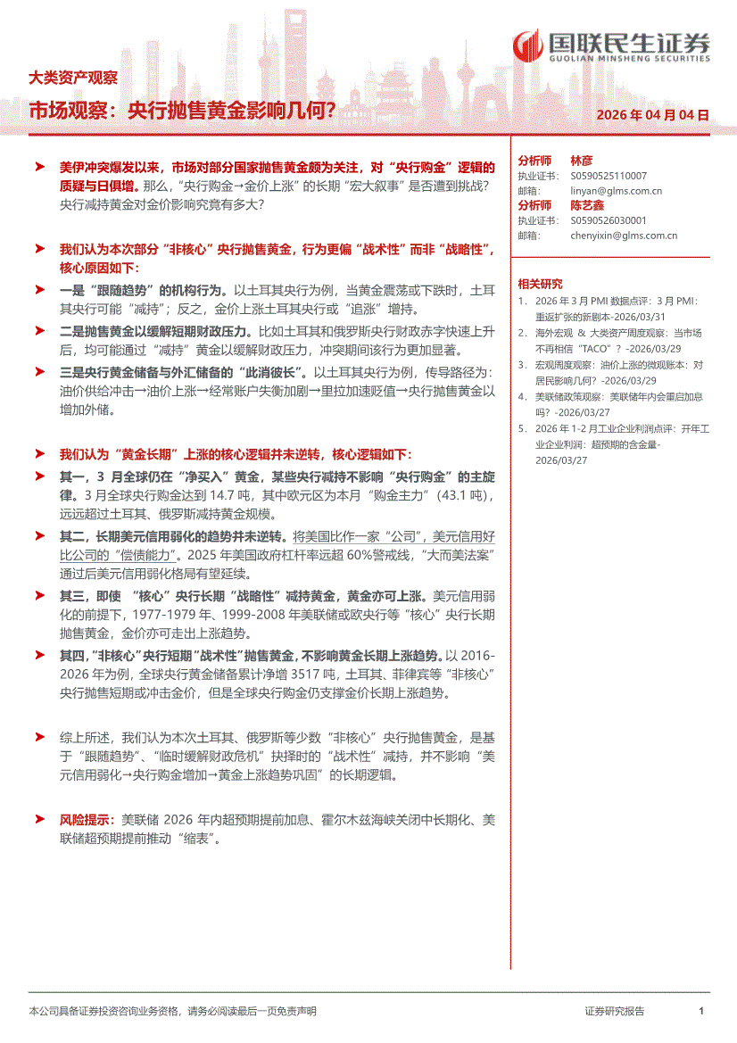 国联民生证券-大类资产观察:市场观察,央行抛售黄金影响几何?-260404