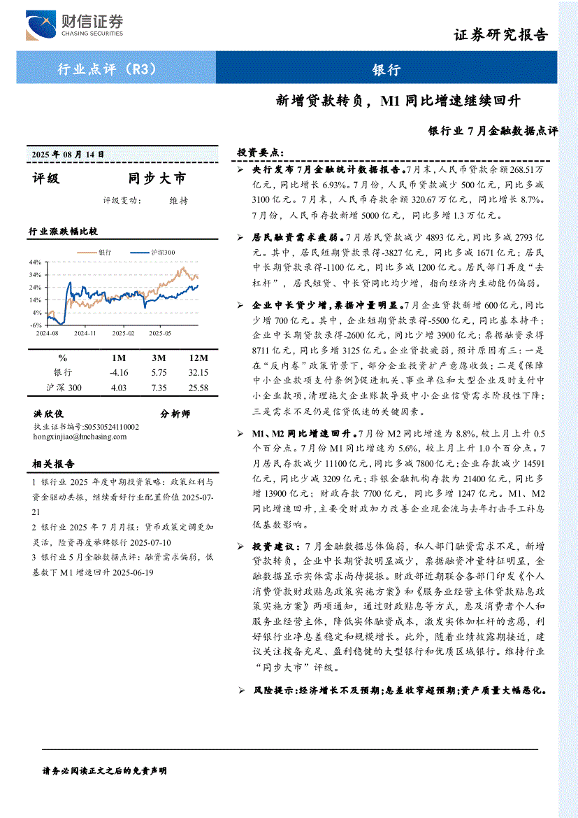 银行业:财信证券-银行业7月金融数据点评:新增贷款转负,M1同比增速继续回升-250814