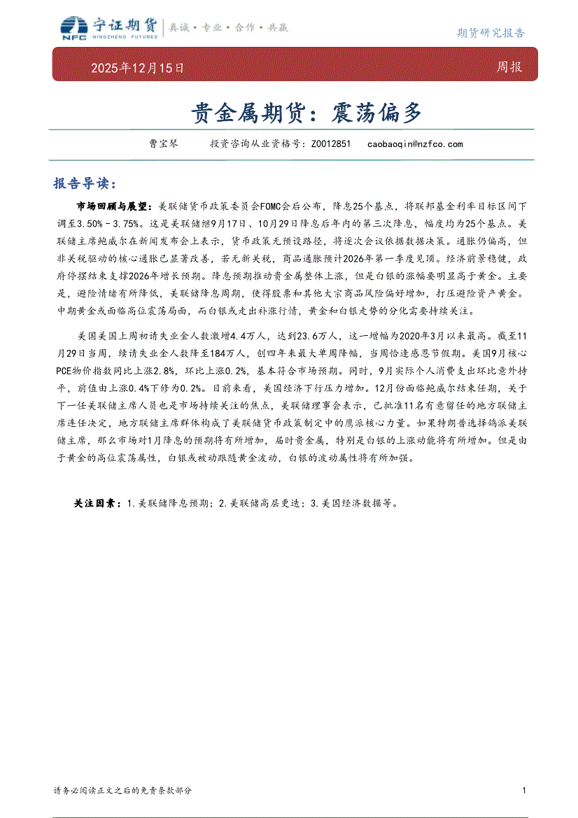 宁证期货-贵金属期货周报:震荡偏多-251215