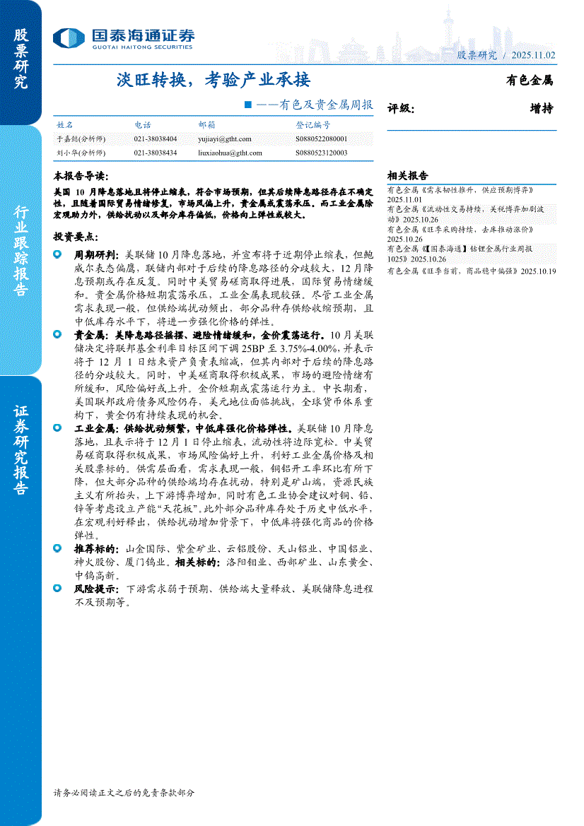 有色金属行业:国泰海通证券-有色金属行业有色及贵金属周报:淡旺转换,考验产业承接-251102