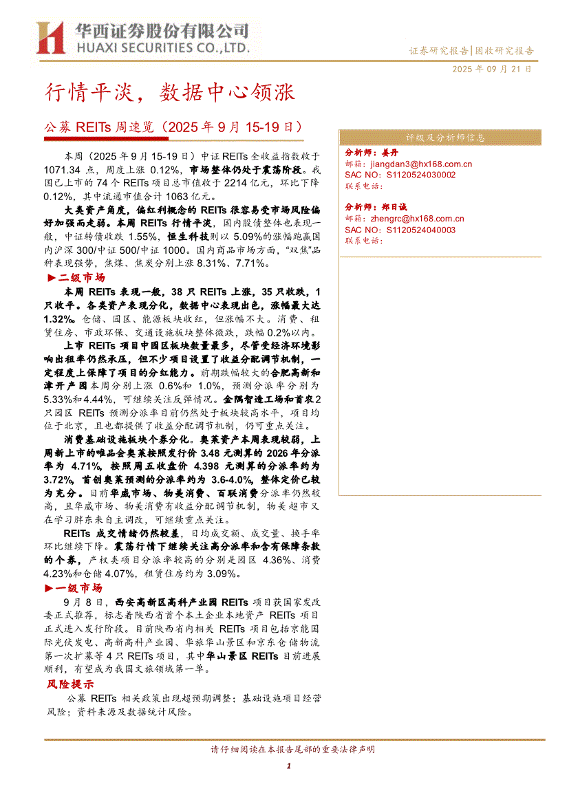 华西证券-公募REITs周速览(2025年9月15~19日):行情平淡,数据中心领涨-250921