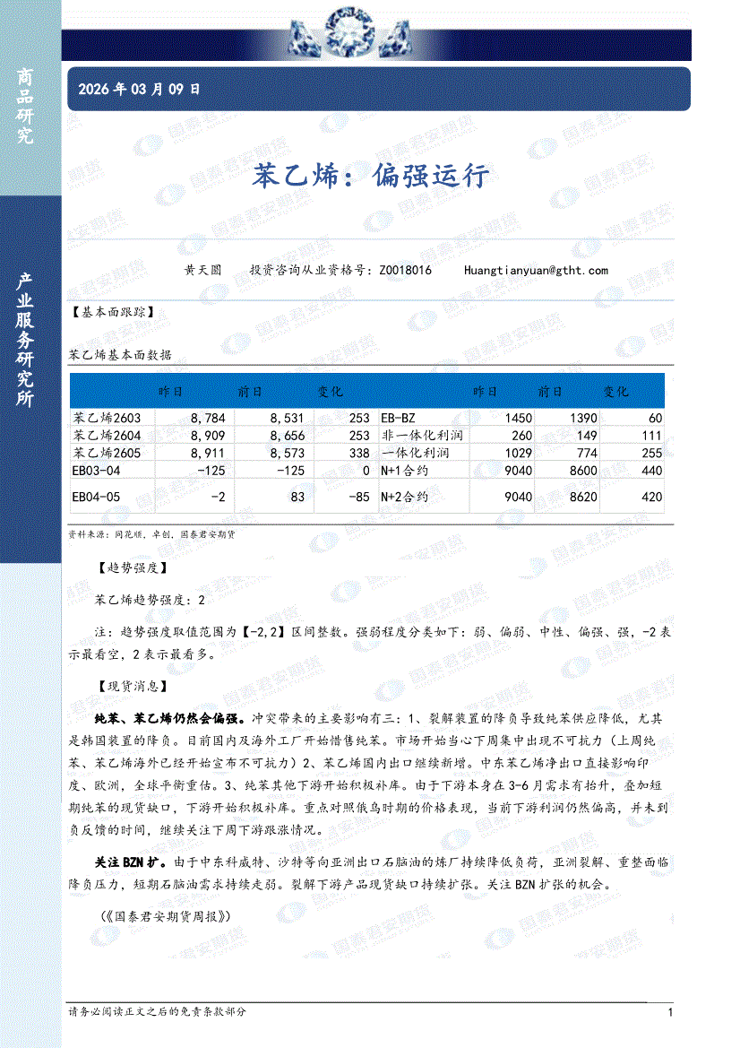国泰君安期货-BZ&EB周报:纯苯、苯乙烯偏强-260315