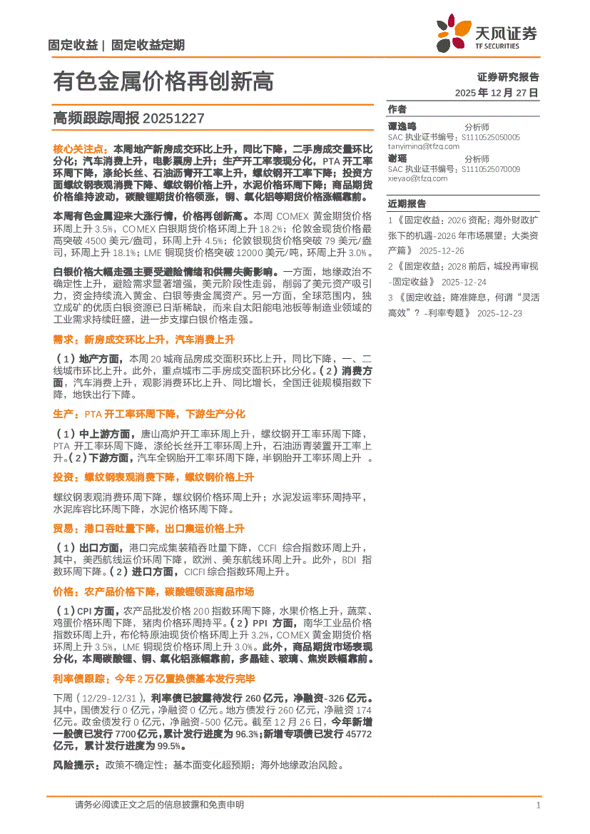 天风证券-高频跟踪周报:有色金属价格再创新高-251227