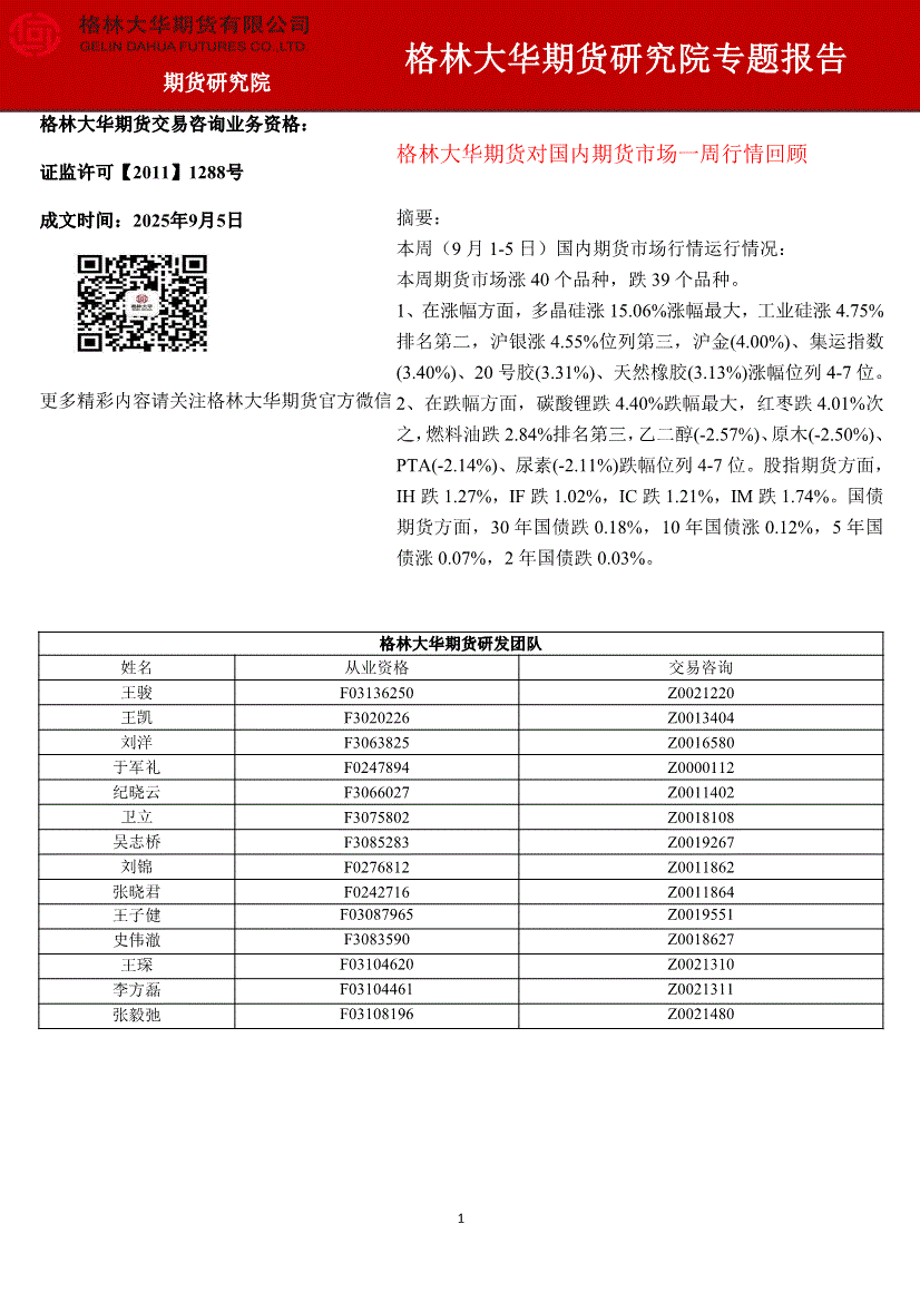 格林大华期货-对国内期货市场一周行情回-250905