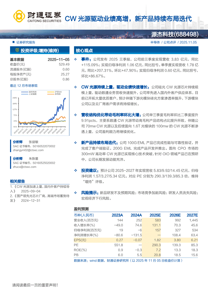 源杰科技:财通证券-源杰科技-688498-CW光源驱动业绩高增,新产品持续布局迭代-251105