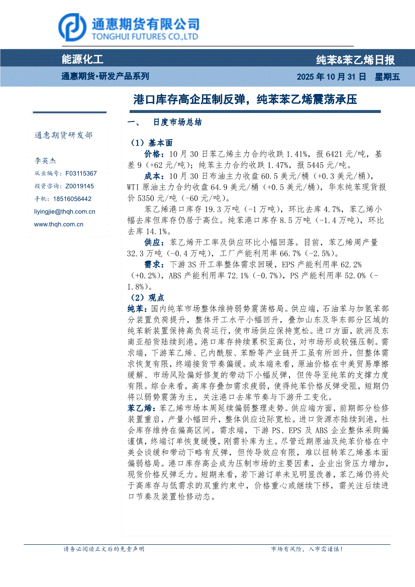 通惠期货-纯苯&苯乙烯日报:港口库存高企压制反弹,纯苯苯乙烯震荡承压-251031