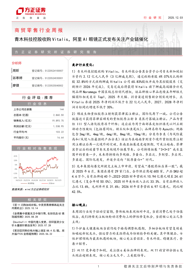 商贸零售行业:方正证券-商贸零售行业周报:青木科技控股收购Vitalis,阿里AI眼镜正式发布关注产业链催化-251203