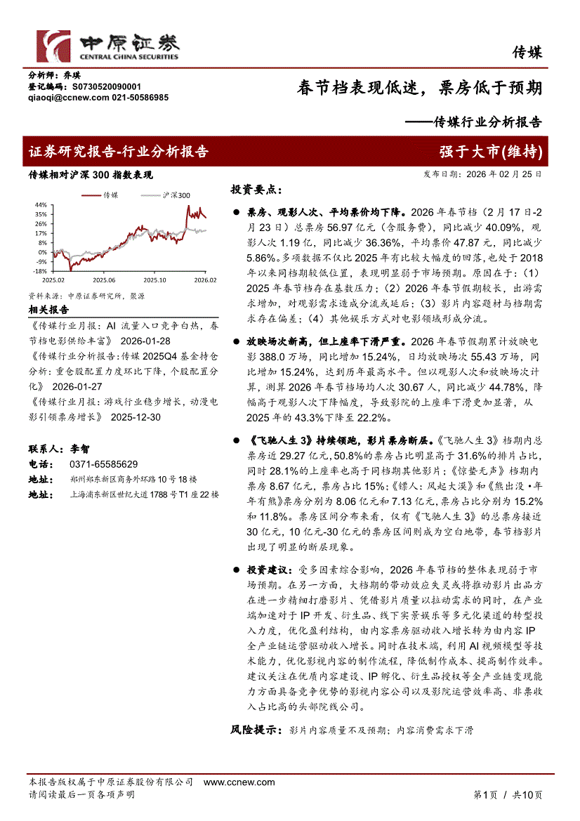传媒行业:中原证券-传媒行业分析报告:春节档表现低迷,票房低于预期-260225