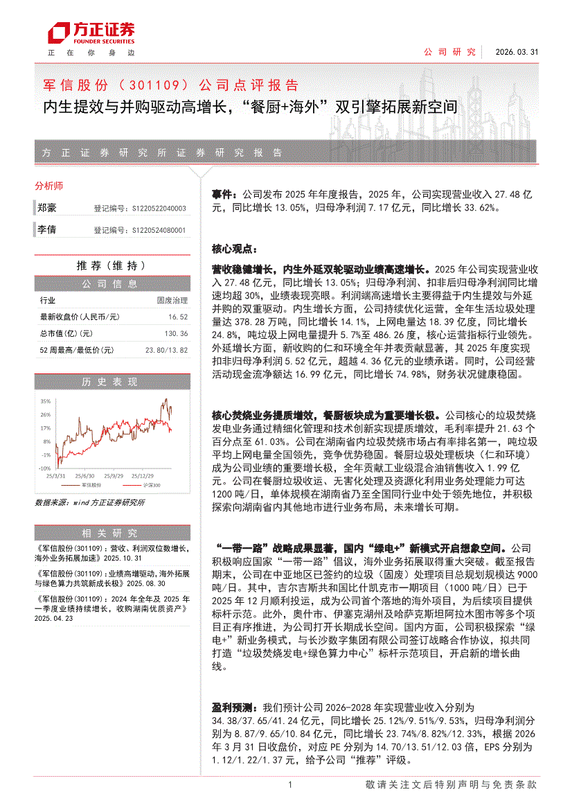 军信股份:方正证券-军信股份-301109-公司点评报告:内生提效与并购驱动高增长,“餐厨+海外”双引擎拓展新空间-260331