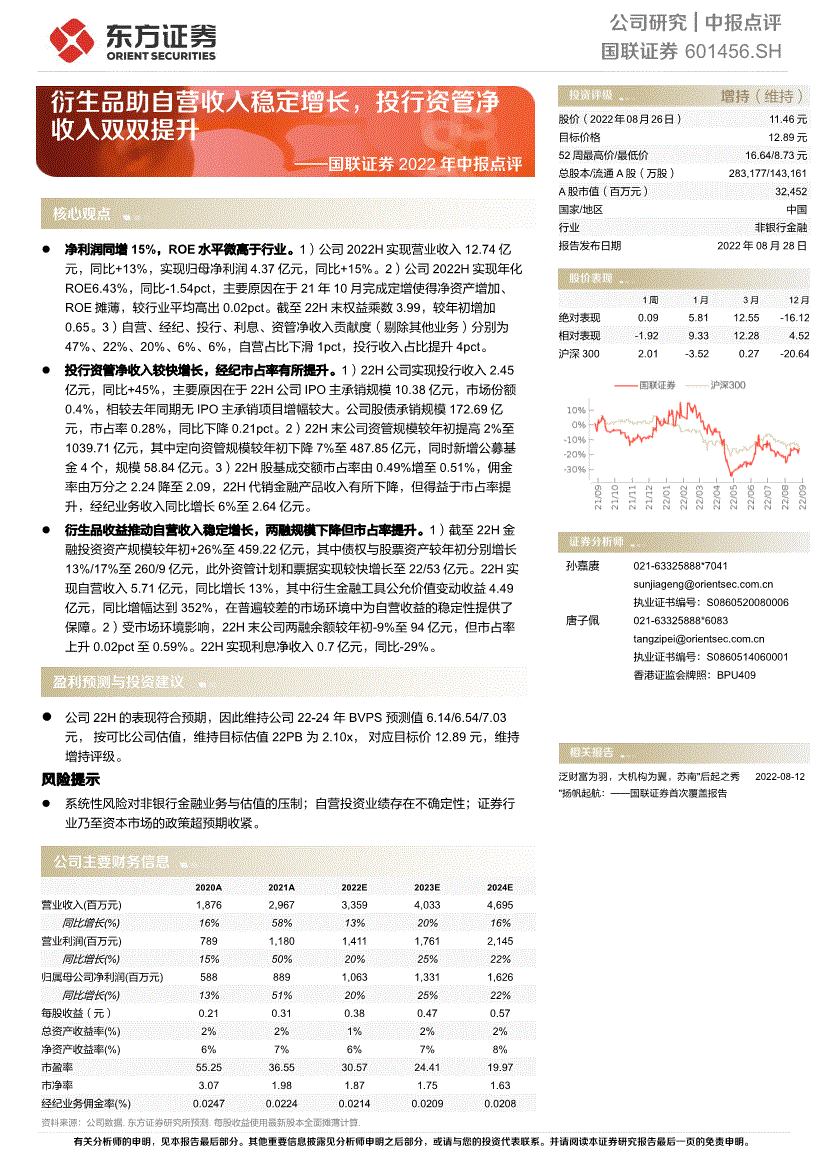 国联证券:东方证券-国联证券-601456-2022年中报点评:衍生品助自营收入稳定增长,投行资管净收入双双提升-220826