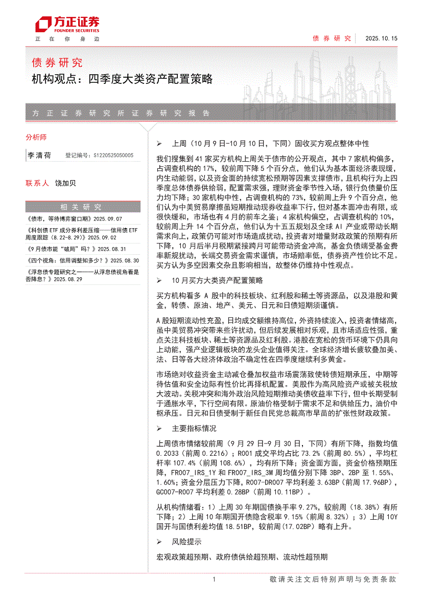 方正证券-债券研究:机构观点,四季度大类资产配置策略-251015