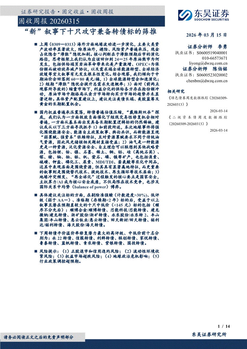 东吴证券-固收周报:“新”叙事下十只攻守兼备转债标的筛推-260315