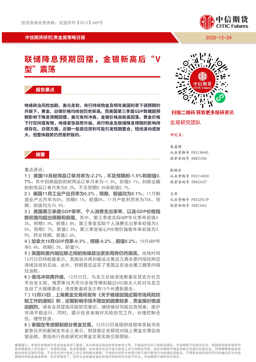 中信期货-贵金属策略日报:联储降息预期回摆,金银新高后“V型”震荡-251224