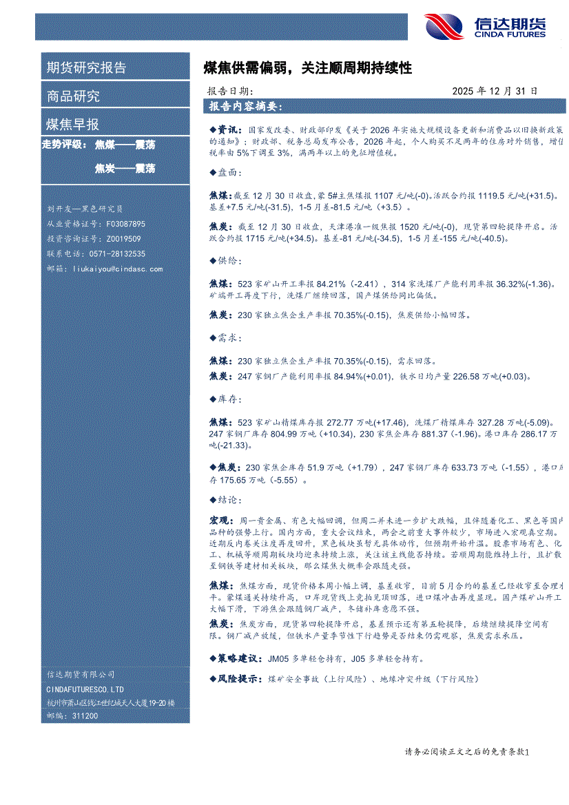 信达期货-煤焦早报:煤焦供需偏弱,关注顺周期持续性-251231