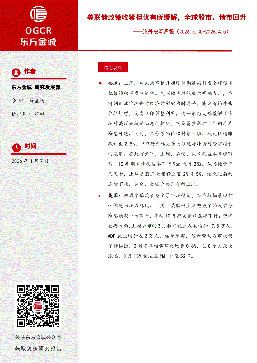 东方金诚-海外宏观周报:美联储政策收紧担忧有所缓解,全球股市、债市回升-260407