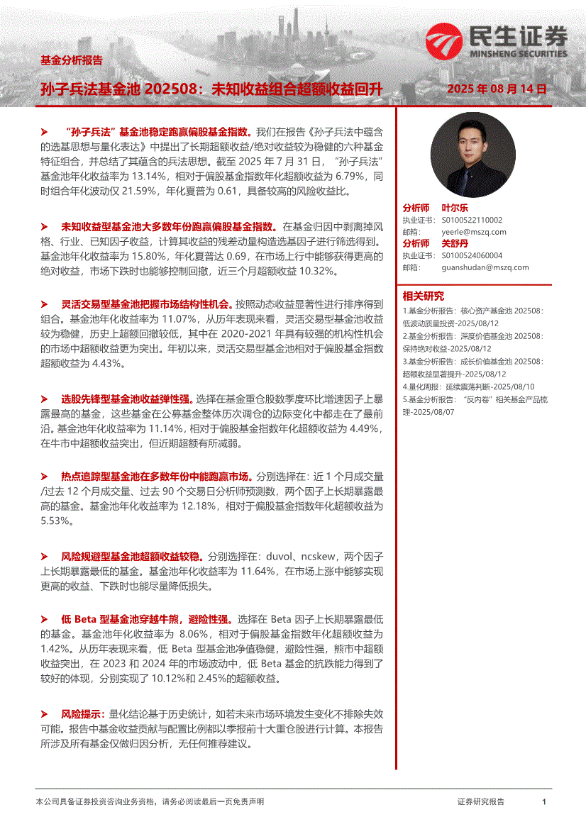 民生证券-基金分析报告:孙子兵法基金池,未知收益组合超额收益回升-250814