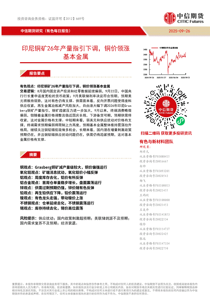 中信期货-有色每日报告:印尼铜矿26年产量指引下调,铜价领涨基本金属-250926