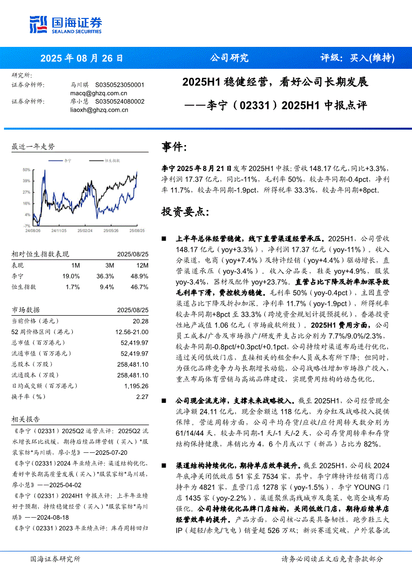 李宁:国海证券-李宁-2331.HK-2025H1中报点评:2025H1稳健经营,看好公司长期发展-250826