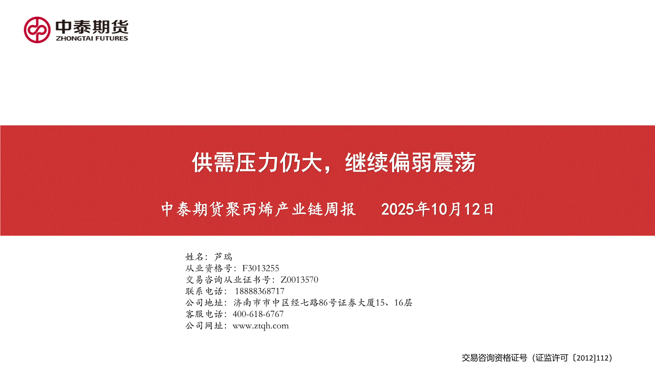 中泰期货-聚丙烯产业链周报:供需压力仍大,继续偏弱震荡-251012