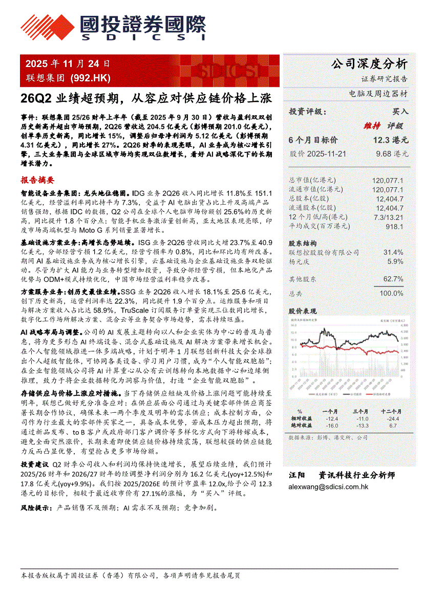 联想集团:国证国际-联想集团-0992.HK-26Q2业绩超预期,从容应对供应链价格上涨-251124