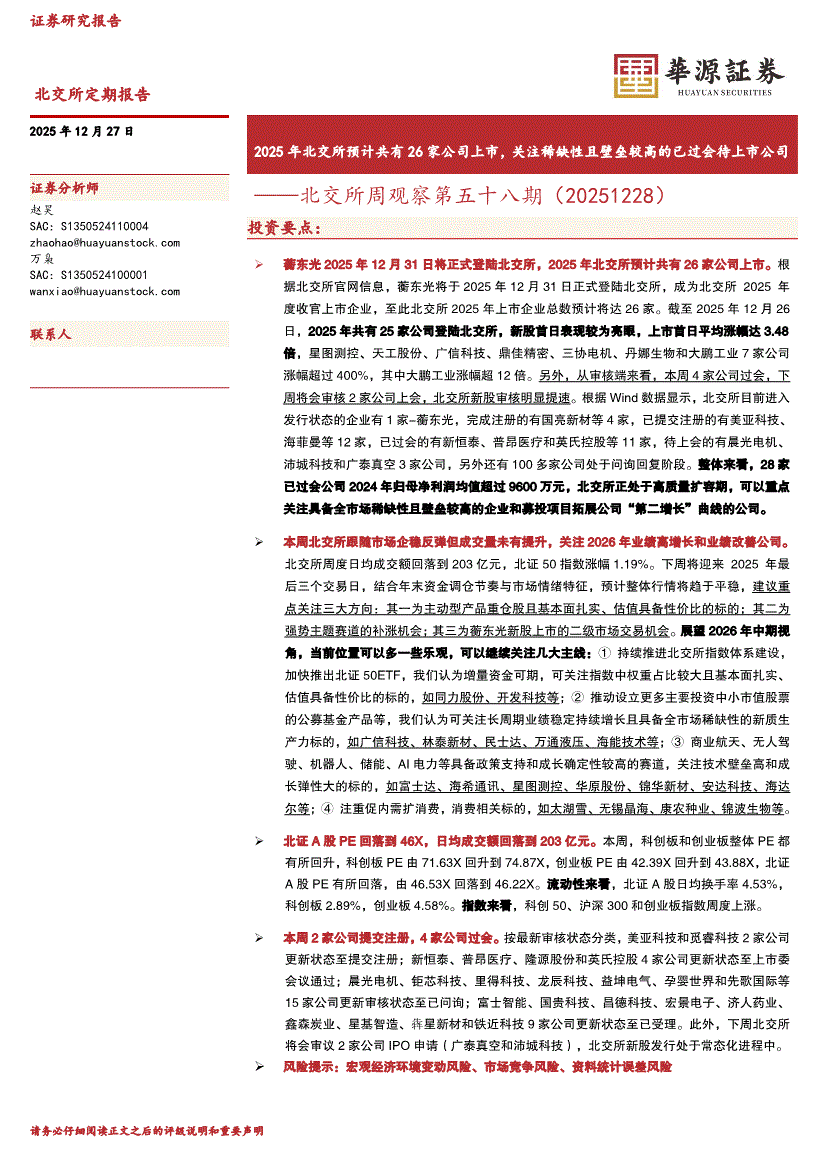 华源证券-北交所周观察第五十八期:2025年北交所预计共有26家公司上市,关注稀缺性且壁垒较高的已过会待上市公司-251227